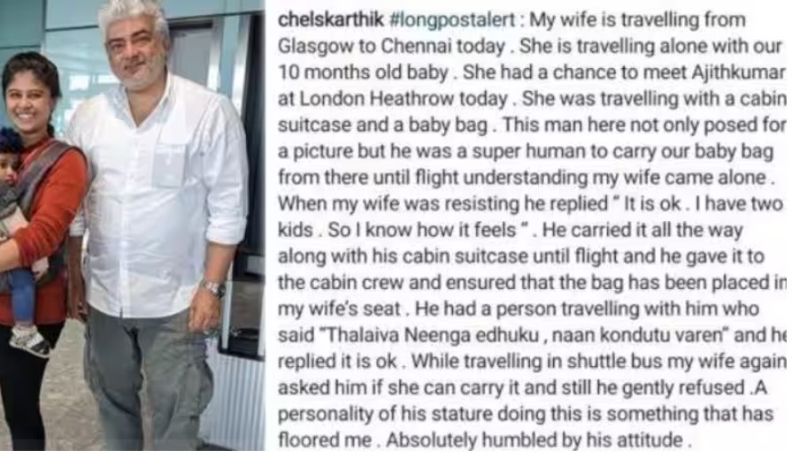 പത്ത് മാസം പ്രായമുള്ള കുഞ്ഞിനെയും കൊണ്ട് യാത്ര ചെയ്ത യുവതിയുടെ ലഗേജ് ചുമന്ന് പുറത്തെത്തിച്ച് നടനെക്കുറിച്ചാണ് കുറിപ്പ്. ലണ്ടനില് നിന്നും ചെന്നൈയില് പോകുന്നതിനിടെ വിമാനത്താവളത്തില് വെച്ചാണ് യുവതി അജിത്തിനെ കാണുന്നത്. യുവതിയുടെ പ്രശ്നം നേരില് കണ്ടതോടെയാണ് അജിത് കുമാര് അവരെ സഹായിച്ചത്.