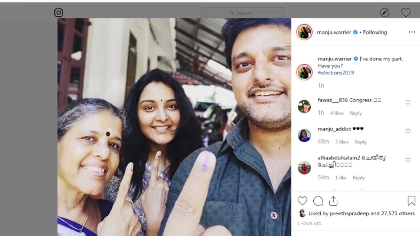 നടന് മമ്മൂട്ടി, ദിലീപ്, ടൊവിനോ തോമസ്, ജയസൂര്യ ഫഹദ് ഫാസില്, നടി മഞ്ജുവാര്യര്, പാര്വതി, അനുശ്രീ, ഭാമ തുടങ്ങിയ പ്രമുഖര് സമ്മതിദാന അവകാശം വിനിയോഗിച്ചപ്പോള് ഇവരെത്തിയ ബൂത്തുകളിലെ വോട്ടര്മാര്ക്കും താരങ്ങളെ അടുത്ത് കാണാന് കഴിഞ്ഞു.